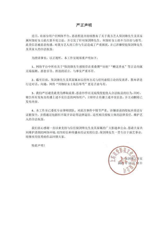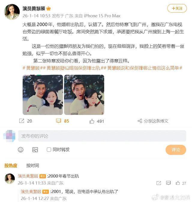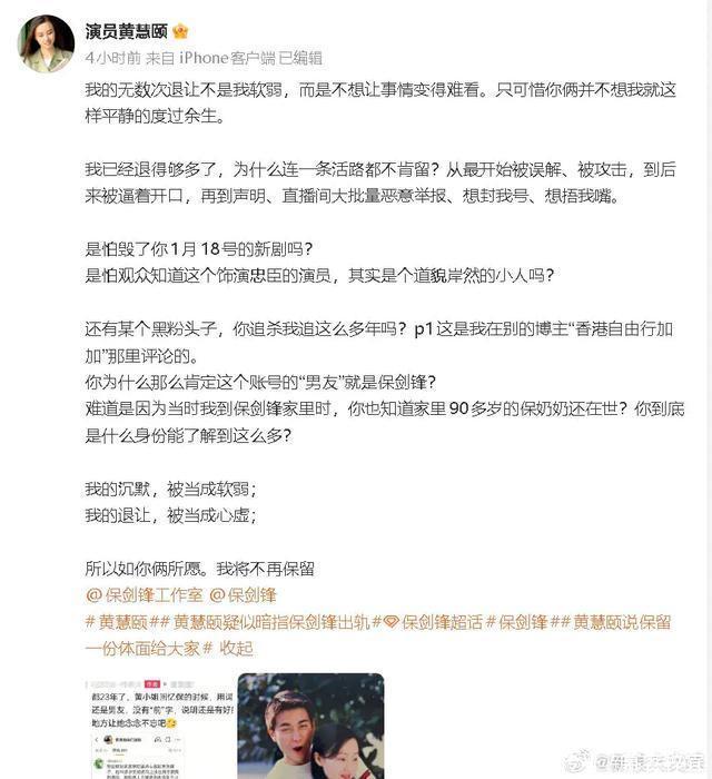1日,演员黄慧颐发博透年保剑锋曾向她求婚,并且年春节的时候婚前出轨。 此前报道 12日,保剑锋工作室发布律师声明,再否认“出轨”、“妈宝男”等传闻:“近期,部分网络用户在我方发布声明后仍持续、恶意散播关于保剑锋先生及家人的不实信息,对其个人声誉构成恶劣影响。我方已诉诸法律,完成初步取证,并启动诉讼。” 此前,12日,演员保剑锋工作室发布严正声明: 针对近期网络用户发布和传播关于保剑锋先生的虚假信息,特此郑重发布声明。 在此,我方再次提醒:请各网络用户提高网络文明素养,切勿肆意造谣传谣。我方将持续关注此类恶性谣言,保留一切法律追究的权利。 声明中提到,网络平台中所有关于“保剑锋先生感情存在重叠期”“出轨”“赠送香水”等言论均属无端揣测,恶意引导,捏造的谣言,与事实严重不符。 12日早晨,保剑锋发文:“今天醒来,然后…我都笑了…哎哈!那编造…也要编得高级一点。”细心网友发现,保剑锋这一博文反复编辑𱅄次。 据潇湘晨报,近日,演员黄慧颐开通社交账号并分享日常,却遭保剑锋妻子私信辱骂及网友质疑。黄慧颐最终选择直播发声,她在直播中透露,2006年的时候放在家里的高档香水,被保剑锋拿去送人,后来看到某女士秀出了同款香水。 黄慧颐在直播中透露,与演员保剑锋年开始恋爱,持续了十年,她特别强调分手时间年。 保剑锋,1975日出生于上海市,籍贯江苏省南通市崇川区唐闸镇,毕业于上海戏剧学院,影视男演员、流行乐歌手。代表作品包括《十八岁的天空》《又见一帘幽梦》《华胥引之绝爱之城》《星汉灿烂》《月升沧海》等。 2009日,演员保剑锋与何珈好的婚礼在上海举行。 黄慧颐,1968日出生于中国广东省,女演员。因在《18岁的天空》中饰演夏清心,在《外来媳妇本地郎》中饰演“祝婉玲”,而被观众熟知。